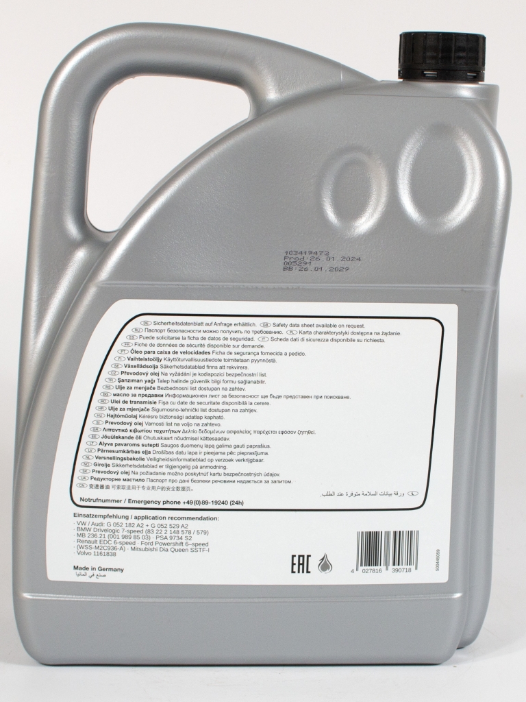Описание - Является высокоэффективным трансмиссионным маслом с широким спектром применения. Поэтому данный продукт подойдет для множества транспортных средств с коробкой передач DSG, называемой также коробкой с двойным сцеплением или коробкой передач прямого переключения. К ним относятся не только 6-ступенчатые коробки DSG, установленные на VW, Audi, Seat и Skoda, но и 7-ступенчатые коробки DSG (отсек сцепления), а также многие другие коробки передач с двойным сцеплением для транспортных средств марок BMW, Ford, Volvo, Mercedes и Peugeot / Citroen.